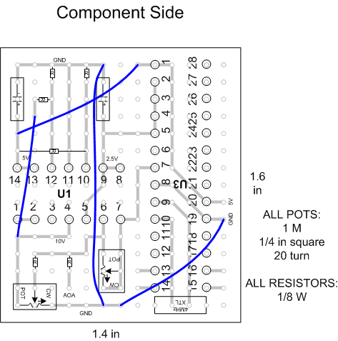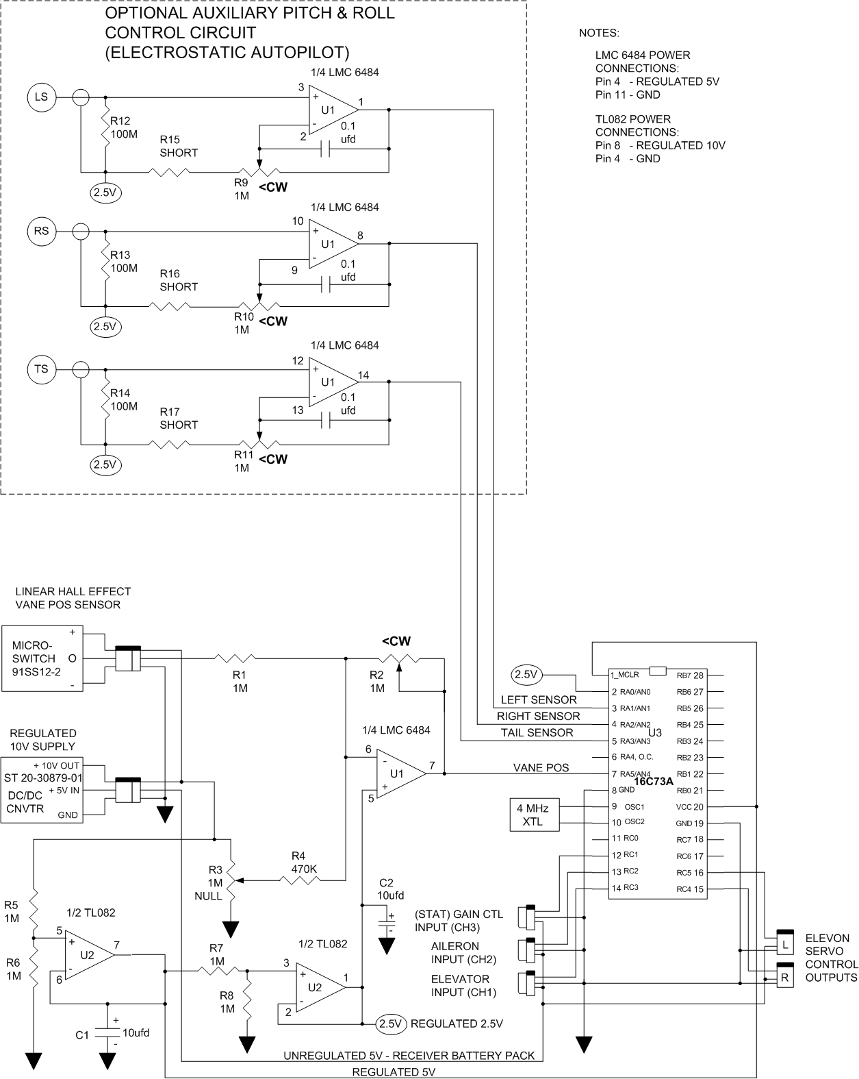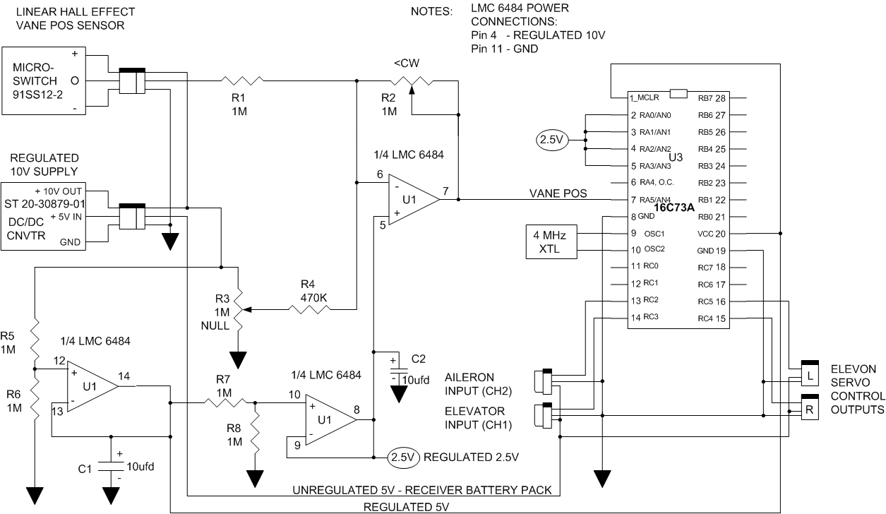 Reference Figures 16 and 17. Outputs from the three electrostatic sensors are amplified, low-pass filtered, and fed to 16C73A microprocessor A/D input pins 3-5 (Albatross II schematic only). The Micro-Switch 91SS12-2 hall-effect element is the heart of the AOA sensor. Its output is center-adjusted with R3 and gain controlled with R2. Regulated 10V output from the ST 20-30879-01 DC/DC powers the hall-effect element. The same 10V source is divided down to produce a regulated 5V-power source for the 16C73A. The 5V is divided down again to produce a regulated 2.5V source.
