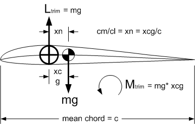 Per the equation there is a tradeoff between trim cl and CG position for a fixed airfoil cm. For example, lets assume the wing airfoil is the MH32, cm = -0.057. From the equation, xn = -0.057/cl. Based on the polar for the MH32, with a comfortable trim cl selection of 0.8, xn = -0.057/0.8 = -0.07, or a CG at 32% of mean chord.
