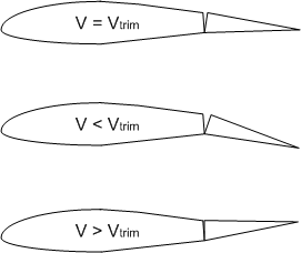 Another interesting consequence of the way the active pitch stabilizer functions is that it provides an automatic flap feature at no extra cost (see Figure 11). Recall that the elevator control signal is also merged with the AOA sensor signal to control the elevon. Intuition suggests that the elevon moves up with up elevator control inputs. Initially this is true, but as the airspeed decreases, cl increases to maintain constant lift and as a result the elevon actually begins to lower to below trim angle since the ratio cm/cl has to remain constant per equation (1). This is so because the CG remains fixed. Similarly, with down elevator control inputs the elevon will eventually move up providing some reflex camber as the flight speed increases in order to satisfy equation (1). This is exactly the correct response for best performance as we saw from the discussion in the “Airfoil Performance Concepts”, Figure 11.