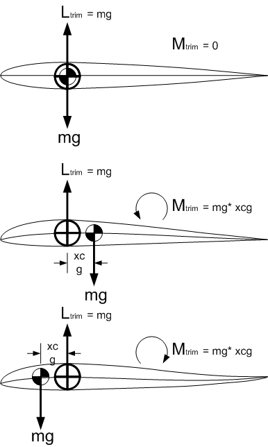 All airfoil lift forces are directed through the aerodynamic center (ac) located at the 25% point of mean chord. Symmetrical airfoils have straight camber lines and, consequently, generate no moments and the CG force vector is in line and opposes the lift vector as shown in the diagram. Lift and CG forces for cambered airfoils are also equal and opposite but are offset horizontally from one another. That horizontal separation develops a moment equal in magnitude but opposite in direction to the camber line induced moment. As a consequence, the CG position offset from ac is linked to the airfoil camber line characteristics. If the CG is forward of ac, the airfoil is stable, has a positive cm, and a reflex camber line. If the CG is aft of ac, the airfoil is unstable, has a negative cm, and a positive camber line. If the CG is at the ac, the airfoil is symmetrical, has a zero cm, and a straight camber line.